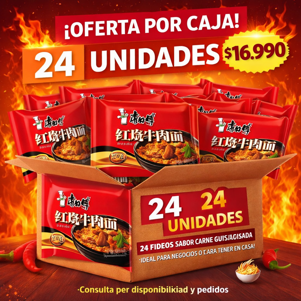 Kang Shi Fu es una de las marcas de noodles instantáneos más reconocidas a nivel mundial, destacando por su sabor intenso, caldo aromático y calidad en sus ingredientes. Cada paquete contiene fideos instantáneos acompañados de condimentos que recrean el tradicional sabor de carne estofada estilo asiático.