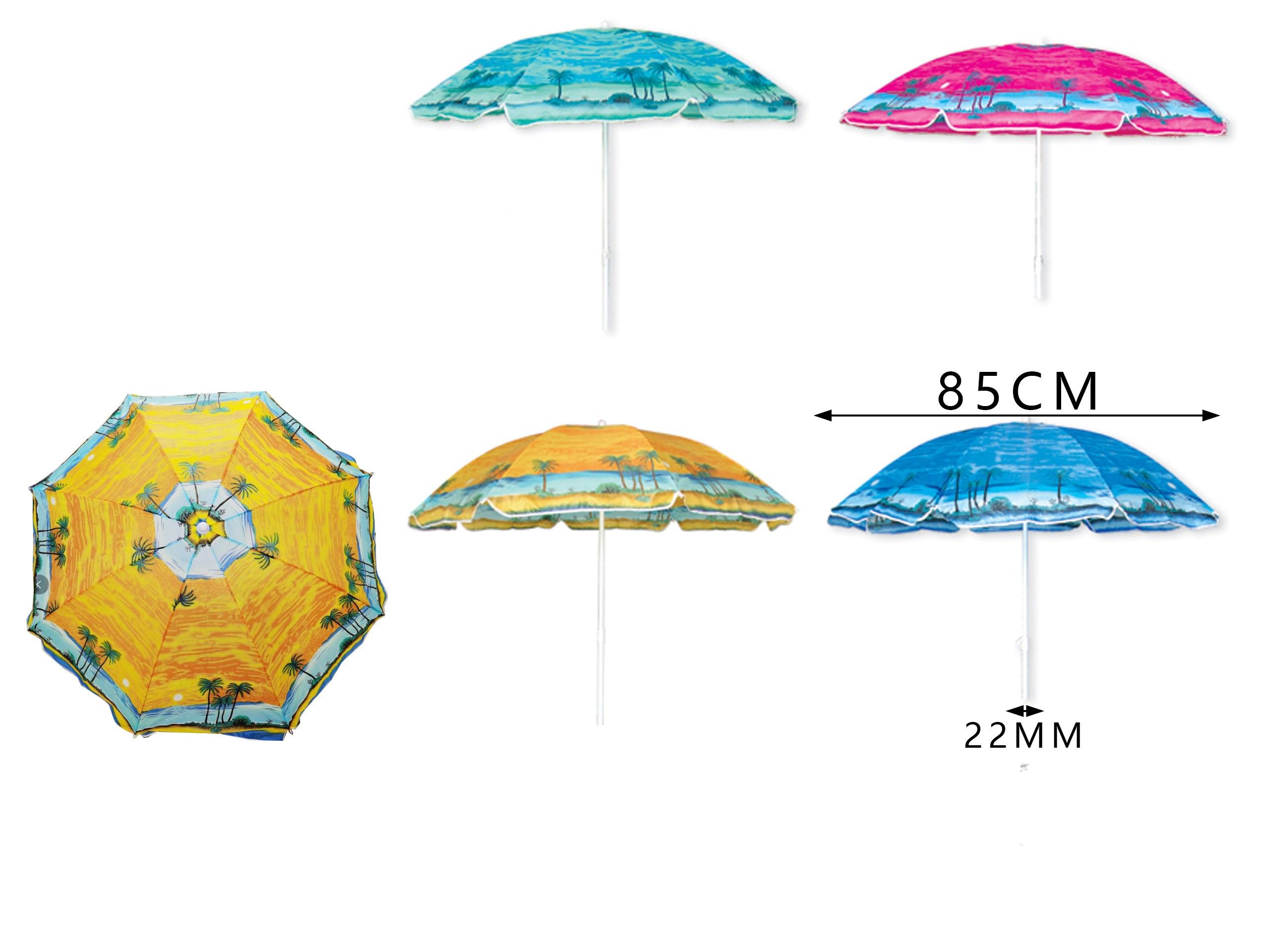 Sombrilla de 85 cm de diámetro con poste de 22 mm, ideal para playa, piscina, jardín o camping. Ligera, práctica y fácil de transportar. Perfecta para proteger del sol en actividades al aire libre.